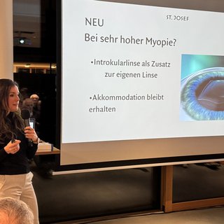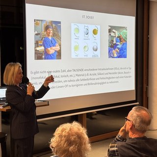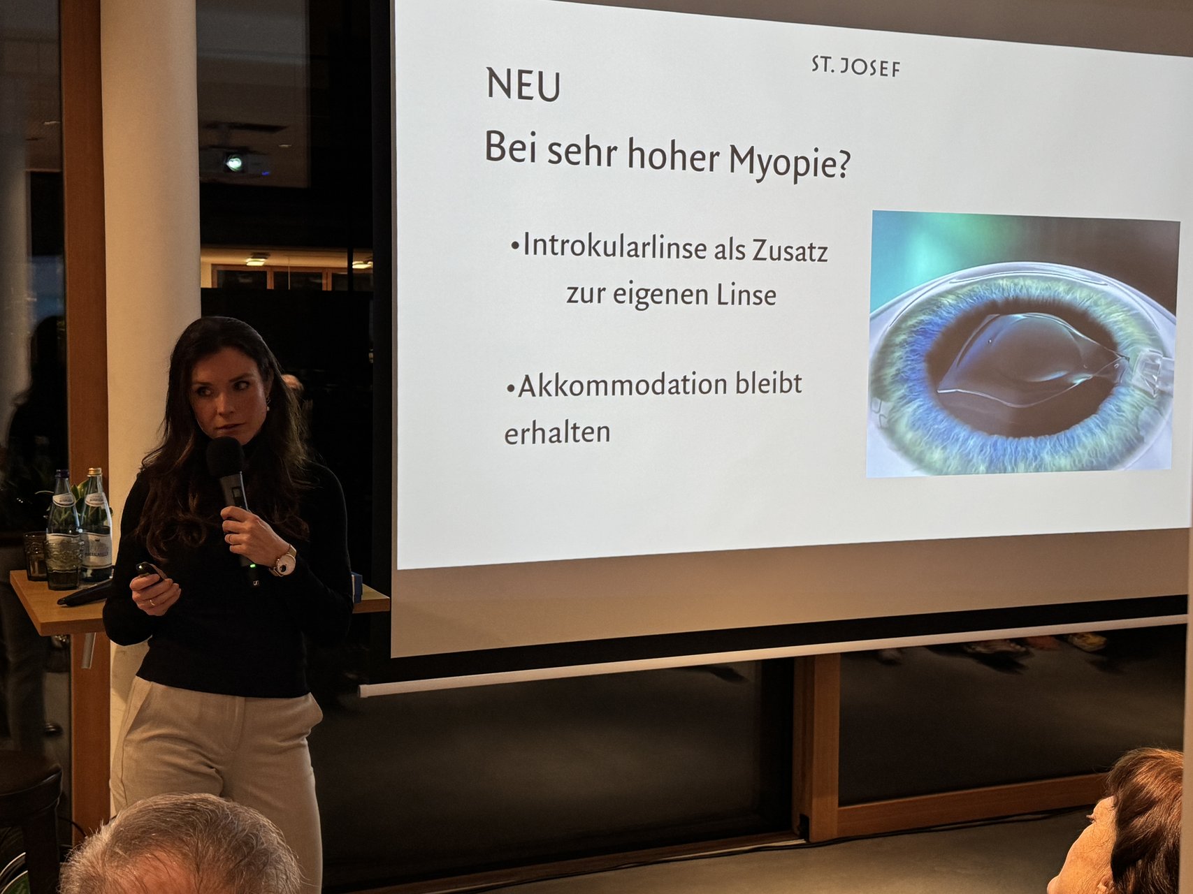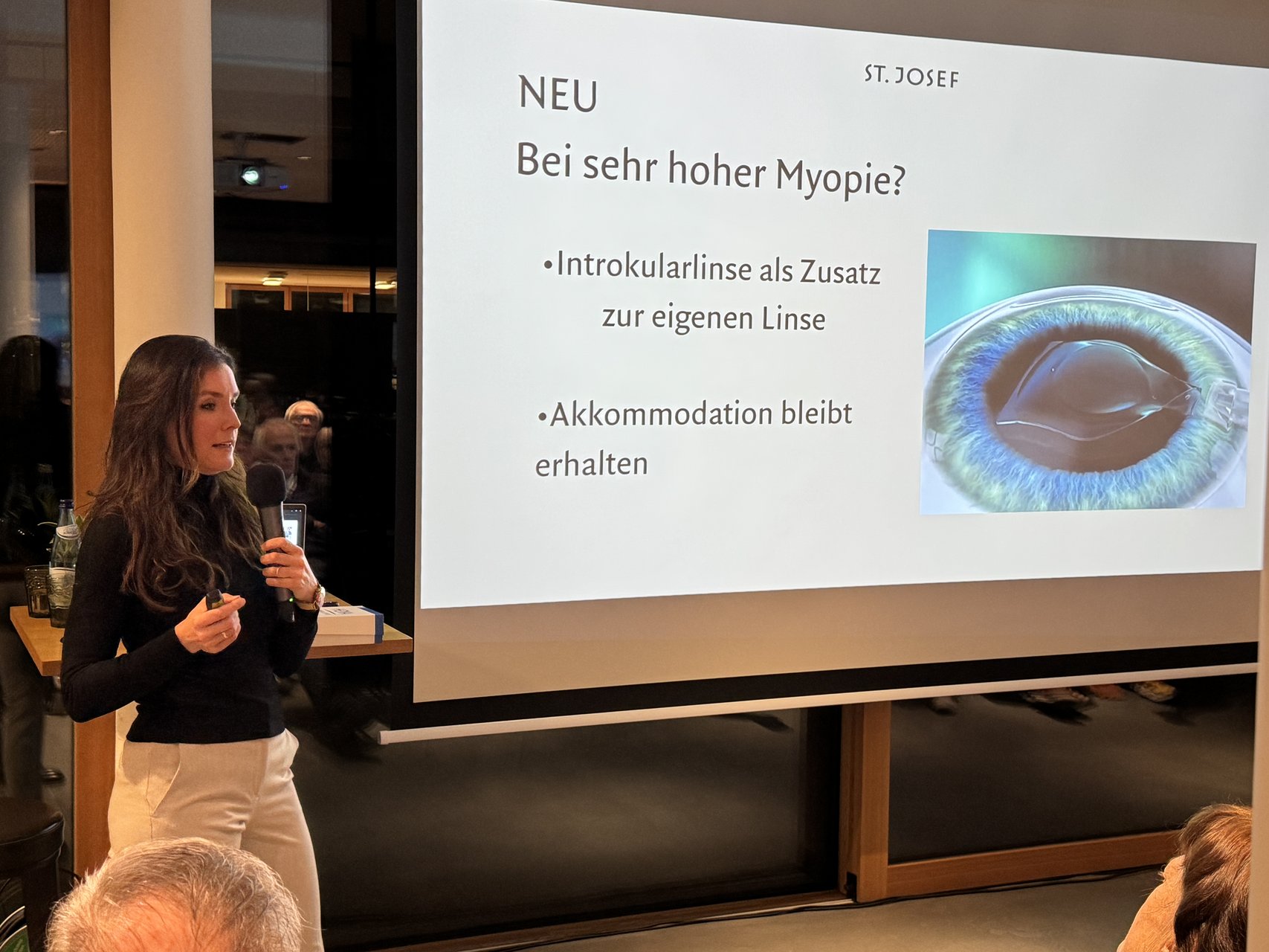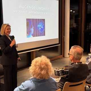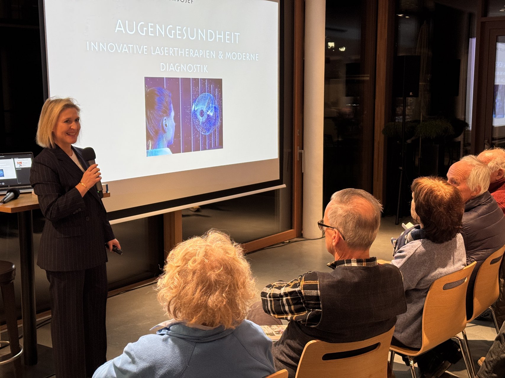 Im zweiten Teil des Vortrags widmete sich Dr. Sigrid Freissinger dem Thema Myopie. Die Tatsache, dass bereits heute rund 33 % der Bevölkerung kurzsichtig sind und Experten davon ausgehen, dass bis 2050 jeder zweite Mensch eine Sehhilfe benötigen wird, zeugt von der hohen Aktualität des Themas. Dr. Freissinger zeigte auf, dass die Brille längst nicht mehr die einzige Option darstellt: Innovative und schonende Lasertherapien ermöglichen heute – und zunehmend auch in Zukunft – ein brillenfreies Sehen. Zudem ging die Ärztin auf die Faktoren ein, die die Entstehung von Kurzsichtigkeit begünstigen, darunter genetische Veranlagung, ein höherer Bildungsgrad sowie lange Bildschirmzeiten. Als besonders interessant erwies sich die Information, dass sich mittlerweile auch die Altersweitsichtigkeit in Kombination mit Fehlsichtigkeiten mittels moderner Laserverfahren korrigieren lässt.