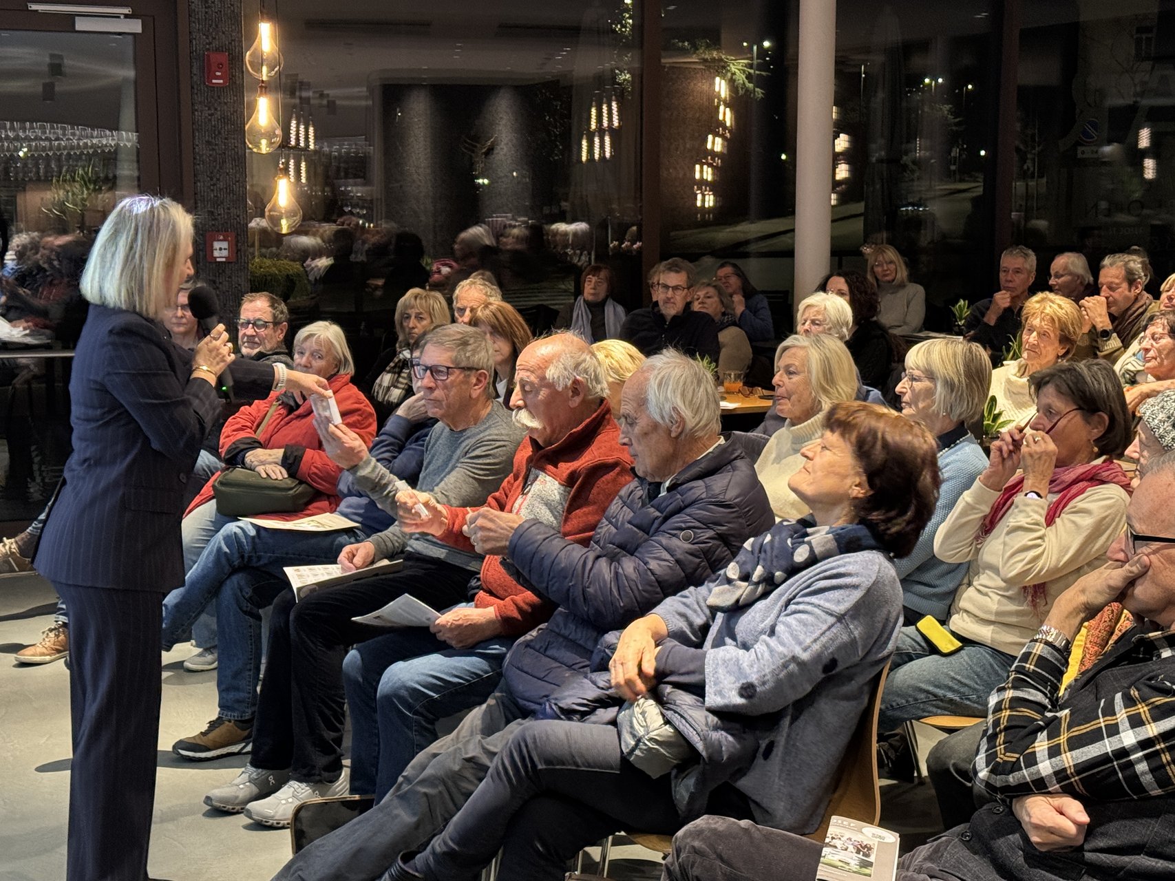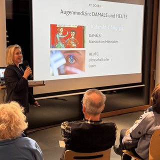 Dr. Dagmar Pedri eröffnete den Abend mit einem historischen Rückblick auf die Entwicklung der Katarakt-Chirurgie. Sie zeichnete den Weg von den drastischen Behandlungsmethoden des Mittelalters bis hin zu den heutigen, hochpräzisen Verfahren mit Ultraschall- und Lasertechnologie nach. Anschließend erläuterte sie Symptome, Diagnose und den genauen Ablauf einer modernen Katarakt-Operation. Besonders eindrucksvoll war der praktische Zugang: Modelle verschiedener Intraokularlinsen machten die unterschiedlichen Linsenmaterialien und -arten unmittelbar tast- und erlebbar. Thematisiert wurde auch der sogenannte Nachstar – eine mögliche Folge einer Katarakt-OP –, der heute unkompliziert und ambulant mittels innovativem YAG-Laser im ST. JOSEF Gesundheitszentrum Meran behandelt werden kann.