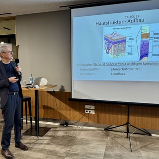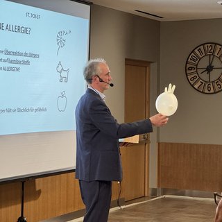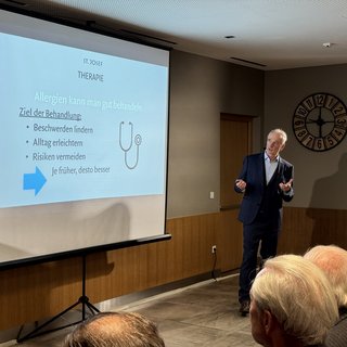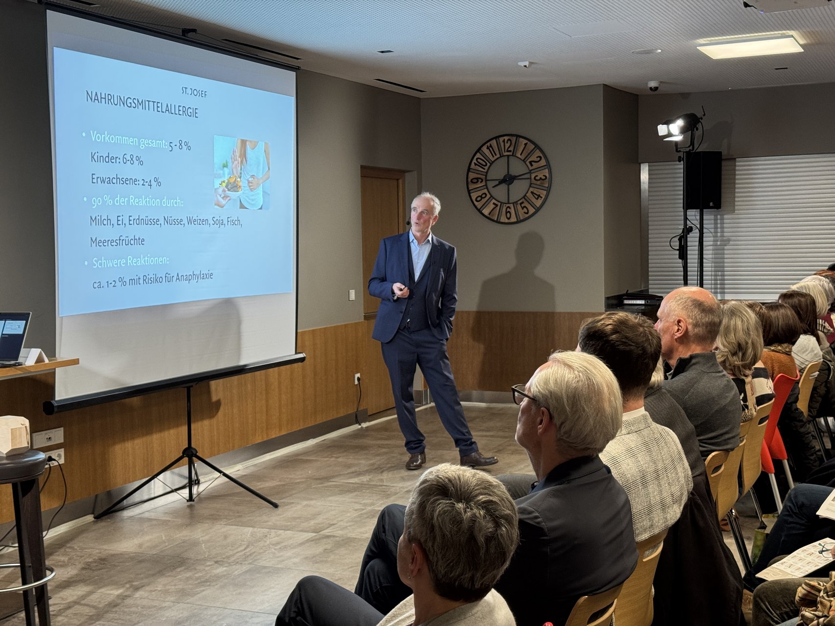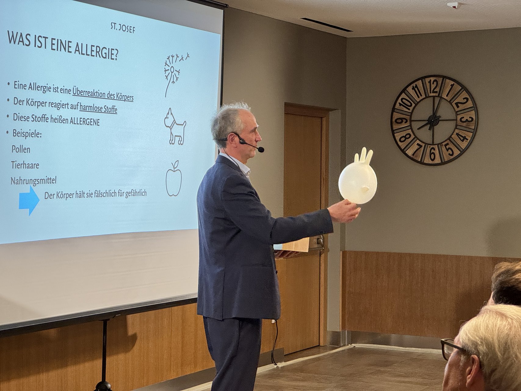Zum Schluss zeigte Dr. Christian Thuile die Therapiemöglichkeiten auf. Neben der konsequenten Allergenkarenz – etwa durch Stoßlüften in den Morgenstunden oder sorgfältige Betthygiene – erläuterte er medikamentöse Optionen und die spezifische Immuntherapie (Hyposensibilisierung), bei der der Körper schrittweise lernt, das Allergen zu tolerieren. Auch die im ST. JOSEF angebotene Entwöhnungstherapie sowie komplementärmedizinische Ansätze wurden thematisiert. Unterm Strich aber gilt: Geduld und Regelmäßigkeit sind das A und O, wenn es um den Behandlungserfolg geht.