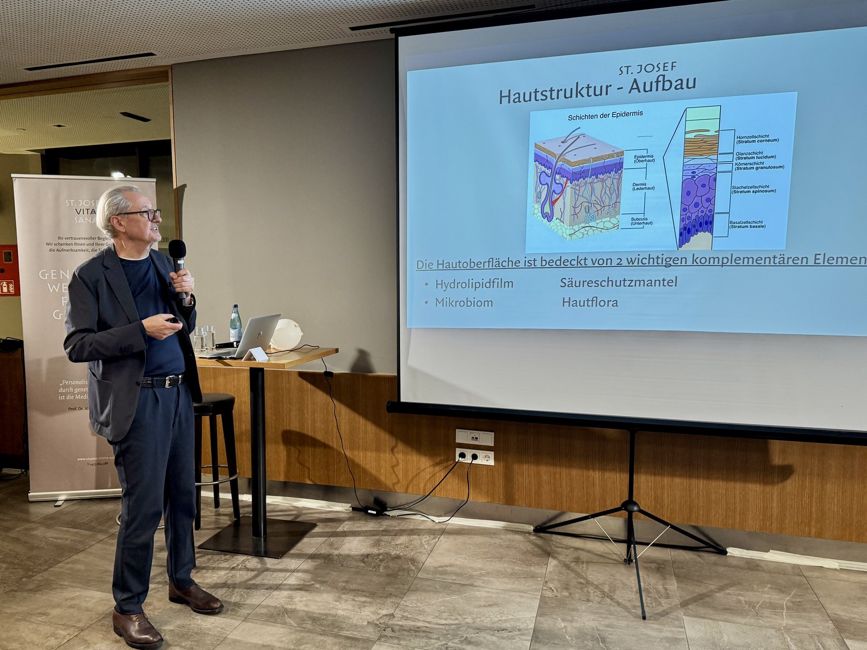 Mit eindrucksvollen Zahlen stieg auch Dr. Oskar Steger in seinen Part des Vortrags ein. Das „Faszinosum Haut“, das mit einer Fläche von 1,8 bis 2 m² und einem Gewicht von 3,5 bis 10 kg das größte Organ des menschlichen Körpers bildet, ist ein zentrales Thema in der modernen Allergologie. So fungiert unser Hautmikrobiom – die natürliche Hautflora – als biologische Schutzbarriere und ist ein aktiver Teil unseres Immunsystems. Ist diese Hautbarriere geschwächt oder gestört – etwa durch trockene Haut –, können Allergene leichter eindringen und eine immunologische Reaktion auslösen, die sich dann in Form von Juckreiz, Rötungen oder Ekzemen äußert. „Begünstigende Faktoren sind hormonelle Veränderungen, eine genetische Prädisposition, Stress, aber auch äußere Einflüsse wie UV-Strahlung, Heizungsluft, ungeeignete Pflegeprodukte oder der Kontakt mit Chemikalien. Auch systemische Erkrankungen wie Diabetes mellitus oder bestimmte Medikamente können als Nebenwirkung zu trockener Haut führen,“ so Dr. Steger.