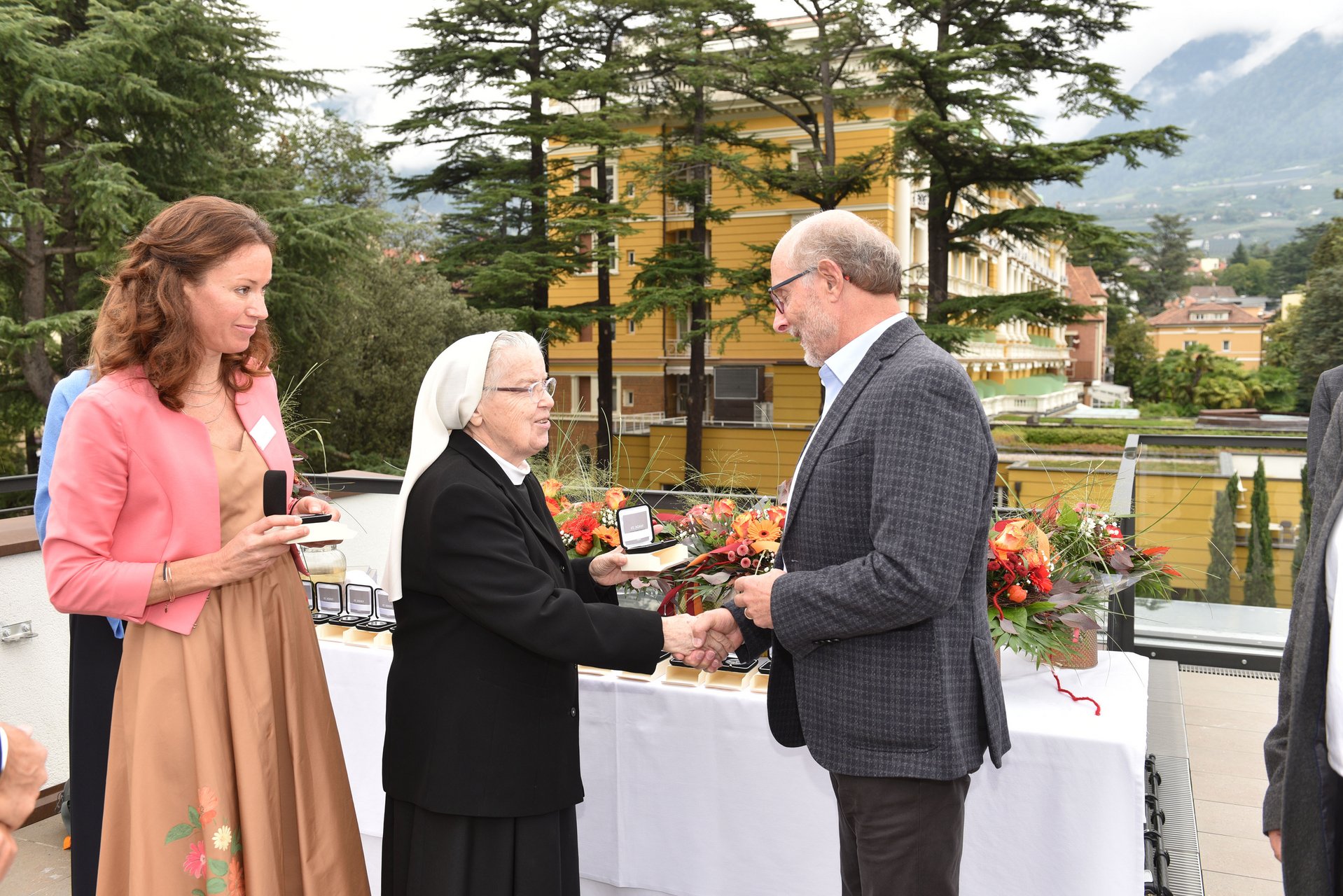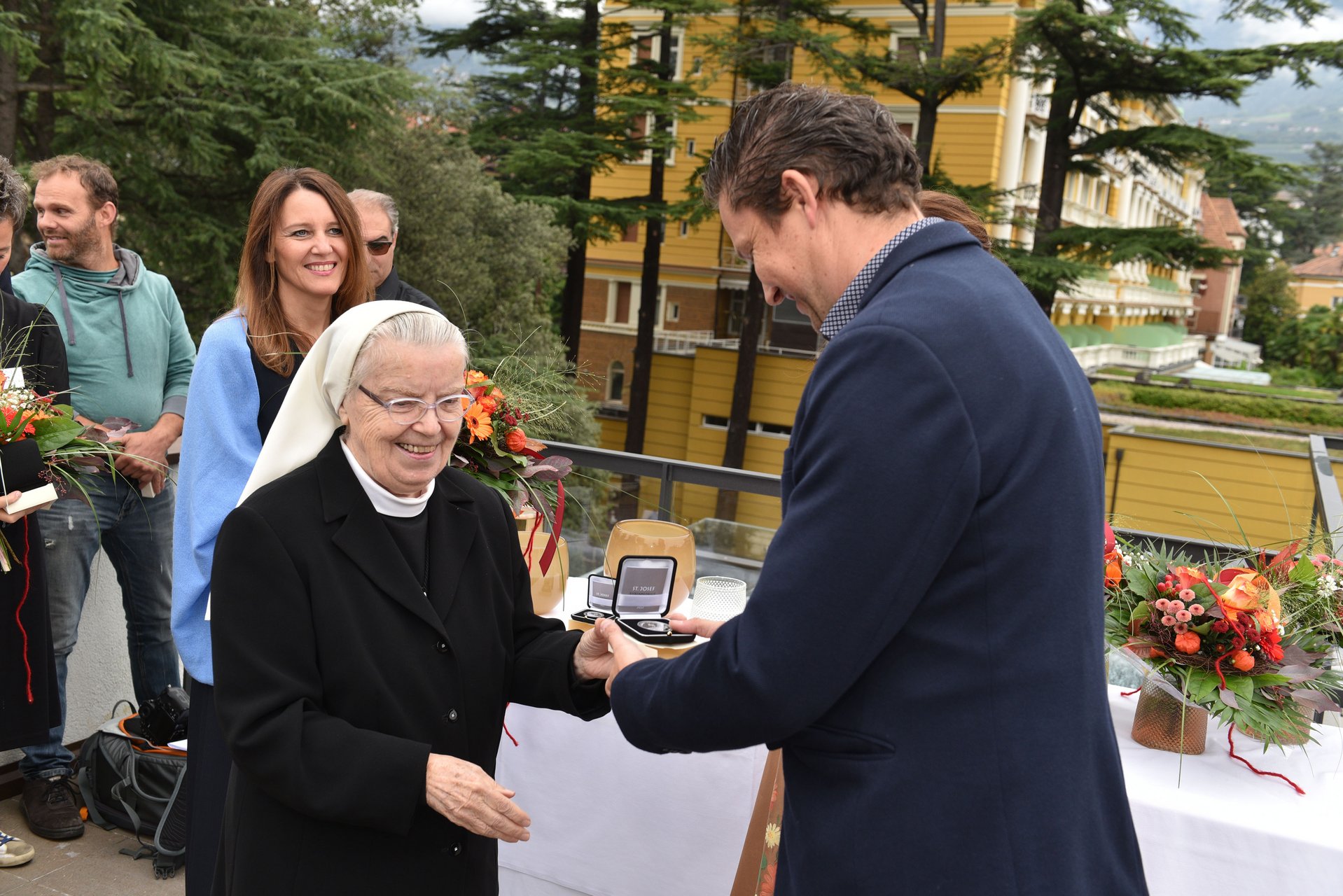 Direktor Sepp Haller dankte im Rahmen der Feierlichkeit verschiedenen Partner*innen, Helfer*innen und Mitarbeiter*innen, die wesentlich zum Gelingen des ST. JOSEF Meran beigetragen haben. Provinzoberin Sr. Erentraud Gruber überreichte die ST. JOSEF Ehrenmedaille der Deutschordensschwestern Lana in Silber als Zeichen der Wertschätzung an Cristina Kury und Christian Wenter, Robert Peer und Klaus Garber, Stefan Thurin, Günther Bernhart und Walter Weger, Robert Vieider, Arnold Gapp und Bruno Marth, Christian Lechner, Franco Schena und Roland Innerebner, Sabine Gamper, Albert Pinggera, Engelbert Bortolotti, Richard Carotta, Christine Schwienbacher, Irene Platter, Hanni Thöni, Urban Grassl, Waltraud Starke und Andreas Federspieler.