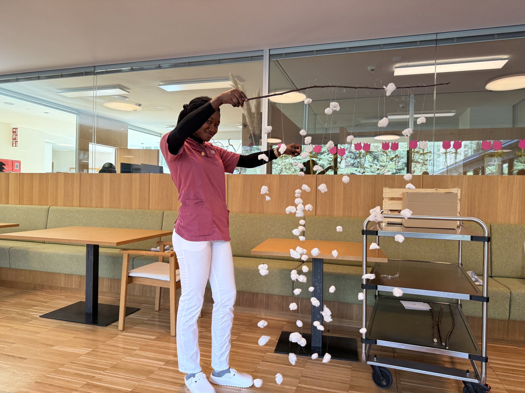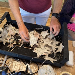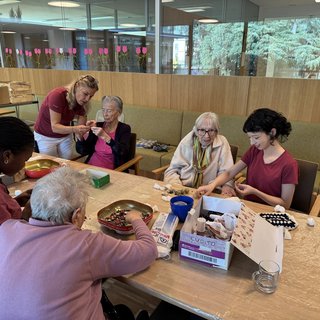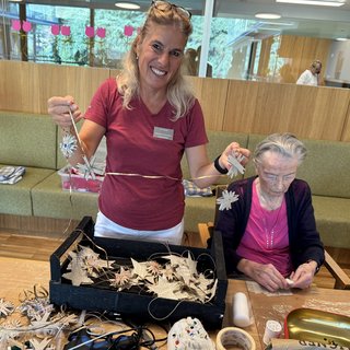 Am Donnerstagvormittag stand im 1. Stock der ST. JOSEF Seniorenresidenz in Meran wieder einmal kreatives Basteln auf dem Programm. Unter der Anleitung von Freizeitgestalterin Claudia Bosa sowie zwei engagierten Praktikantinnen wagten sich die Heimbewohnerinnen dieses Mal an ein vorweihnachtliches Mobile und waren mit großem Eifer und viel Freude bei der Sache.